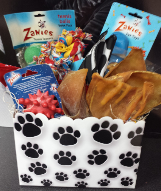 Fun array of toys, pig ears, cow hooves, treats, and bandanas
